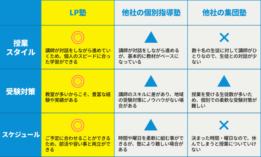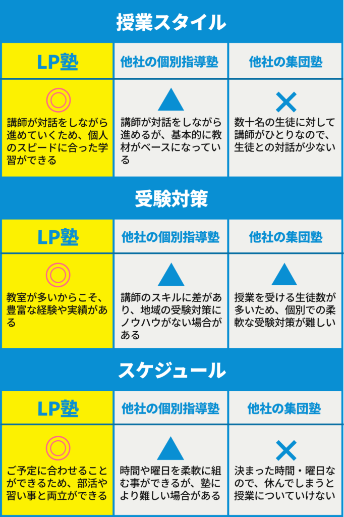 | LP塾 | 他社の個別指導塾 | 他社の集団塾 | |